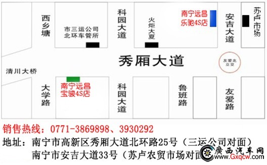 銷售熱線:0771-3930292(樂(lè)馳店)、0771-3869898(寶駿店)