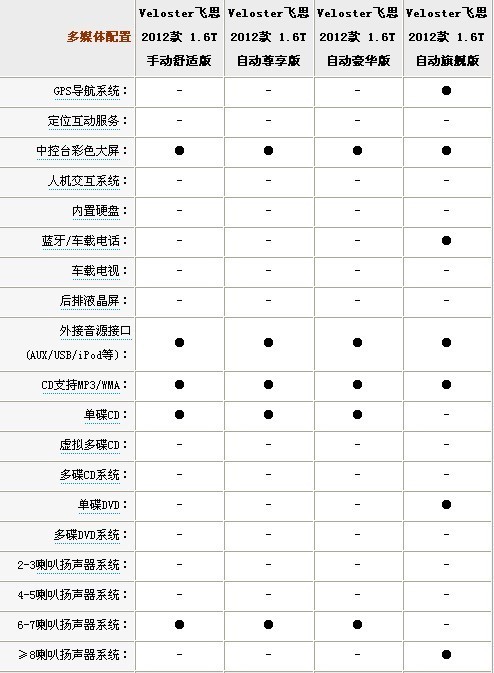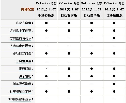 車載影意娛樂系統(tǒng)、RCA影音輸入接口、AUX/USB音頻接口、多功能方向盤屬于飛思1.6T全部車型的標(biāo)準(zhǔn)配置,而自動(dòng)空調(diào)、語音導(dǎo)航系統(tǒng)、Bluelink、高級(jí)音響系統(tǒng)和藍(lán)牙免提功能則只會(huì)出現(xiàn)在頂配旗艦版上面。