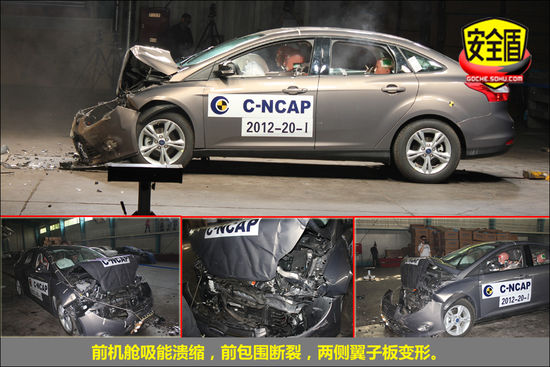 首先來看正面100%碰撞測試成績,新福克斯前機艙因吸收了大部分碰撞能量而潰縮變形,A柱無明顯變形,4門可正常開啟。
