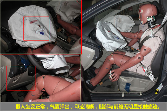 氣囊彈出,A柱無明顯變形,4門可正常開啟。前排2個氣囊正常彈出,很好的保護了前排假人頭部;腿部與前艙接觸痕跡明顯;