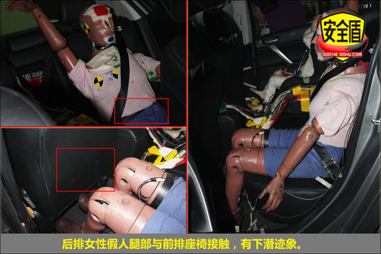 后排女性假人運動幅度較大,腿部與前排椅背有明顯接觸痕跡,有下潛跡象,兒童假人坐姿正常。