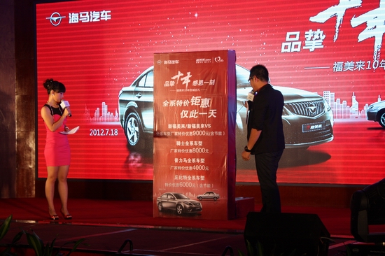 2012年8月11日 ,海馬汽車“品摯十年• 感恩一刻 福美來10年百城巡禮”南寧站的活動在南寧紅林大酒店舉行。到場嘉賓及媒體人士親身領(lǐng)略了福美來十年間的輝煌發(fā)展歷程,感受了福美來作為自主品牌代表所負(fù)載的深厚品牌文化與內(nèi)涵。