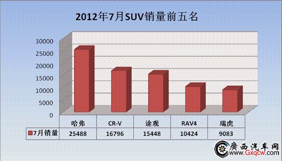 據(jù)乘聯(lián)會數(shù)據(jù)統(tǒng)計:7月銷量前五位SUV分別為哈弗25488輛、CR-V 16796輛、途觀15448輛、RAV4 10424輛、瑞虎9083輛。