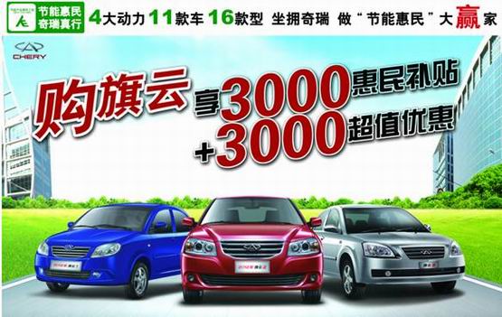 7月,國家發(fā)改委、工信部和財政部聯(lián)合發(fā)布第八批汽車“節(jié)能產品惠民工程”推廣目錄(以下簡稱目錄),奇瑞汽車包括4大動力總成、11款車共計16款車型入圍,成為“節(jié)能惠民”大贏家。其中,奇瑞主銷車型旗云1、旗云2、旗云3憑借出色的節(jié)油性能、豐富的配置、優(yōu)惠的價格及過硬的品質昂首入選,消費者購車即可享受國家3000元惠民補貼。近期,旗云車型除享受3000元惠民補貼外,還可享受3000元超值優(yōu)惠促銷,另外還有“易購貸、“輕松貸”、“安心貸“等多種貸款購車方案可供選擇,消費者成為此次節(jié)能惠民最大的受益者。