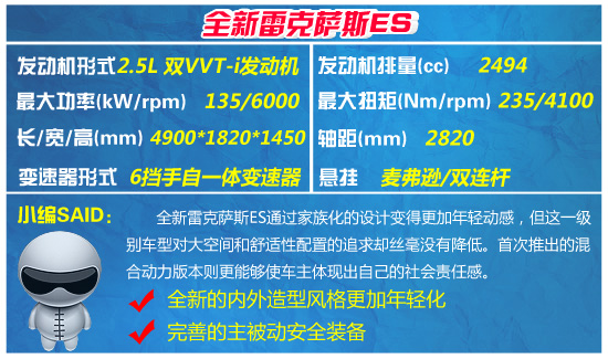 動力方面,全新雷克薩斯ES除了原先的3.5L V6發(fā)動機外,還將有一款2.5L雙VVT-i發(fā)動機出現(xiàn),這款發(fā)動機與凱美瑞2.5上的相同,最大功率135kW,最大扭矩235Nm。與它們匹配的均為一款6速手自一體變速箱。另外,全新ES還將推出混合動力車型ES300h,其搭載一套由排氣量2.5升的Atkinson循環(huán)設(shè)計自然進氣汽油發(fā)動機以及電動馬達所組合而成的Hybrid油電混合動力系統(tǒng),可變式儀表顯示系統(tǒng)則會出現(xiàn)在這款混動車型中。