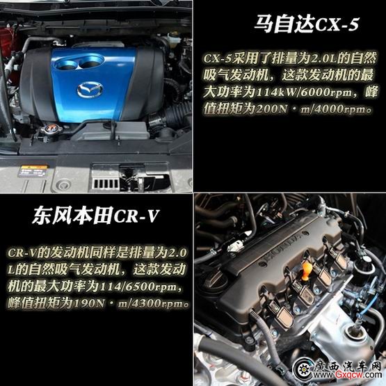 在發(fā)動(dòng)機(jī)方面,CX-5采用了排量為2.0L的自然吸氣發(fā)動(dòng)機(jī),這款發(fā)動(dòng)機(jī)的最大功率為114kW/6000rpm,峰值扭矩為200Nm/4000rpm,具有隸屬于創(chuàng)馳藍(lán)天系列的Dual S-VT 雙可變氣門正時(shí)控制系統(tǒng),再加上它高達(dá)13:1的壓縮比,才造就它遠(yuǎn)超同排量發(fā)動(dòng)機(jī)的輸出數(shù)據(jù)。CR-V的發(fā)動(dòng)機(jī)同樣是排量為2.0L的自然吸氣發(fā)動(dòng)機(jī),這款發(fā)動(dòng)機(jī)的最大功率為114/6500rpm,峰值扭矩為190Nm/4300rpm,采用了大家比較熟悉的i-vtec技術(shù)。從數(shù)值上說它并不遜于CX-5的發(fā)動(dòng)機(jī),但是從技術(shù)上來說,更新的CX-5已經(jīng)處于領(lǐng)先地位,這從CX-5 6.7L的百公里綜合油耗以及CR-V 8.0L的百公里綜合油耗就可看出。
