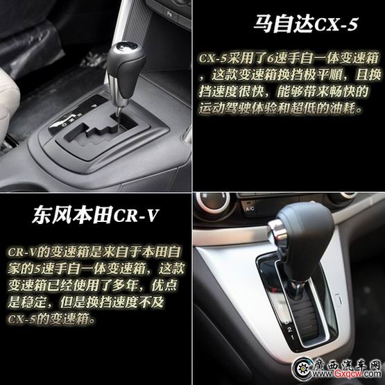 在變速箱方面,CX-5采用了6速手自一體變速箱,這款變速箱換擋極平順,且換擋速度很快,能夠帶來暢快的運(yùn)動(dòng)駕駛體驗(yàn)和超低的油耗。CR-V的變速箱是來自于本田自家的5速手自一體變速箱,這款變速箱已經(jīng)使用了多年,雖說具有穩(wěn)定的特點(diǎn),但是換擋速度和平順程度與CX-5搭載的最新產(chǎn)品有一定差距。
