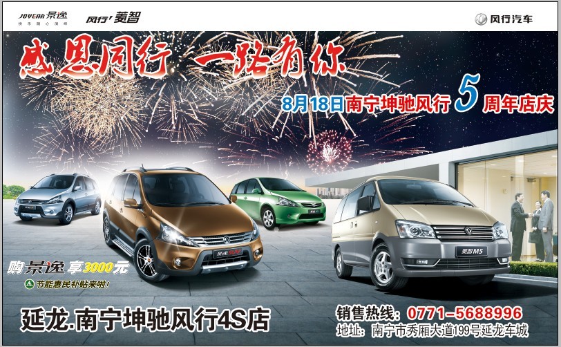 2012年8月,南寧坤馳汽車有限公司成立5周年,為了答謝眾多老用戶對(duì)南寧坤馳風(fēng)行店的支持,8月南寧坤馳將推出眾多回饋新老客戶的活動(dòng),屆時(shí)將邀請(qǐng)一直多年陪伴坤馳多年的老用戶們到店參與。