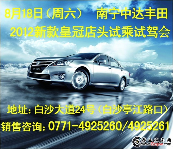 據(jù)了解,8月18日(周六)一汽豐田南寧中達(dá)店將舉辦2012新款皇冠店頭試乘試駕會。試駕百元禮,置換禮包更豐厚、0利率便捷購車、全車系可深度試駕體驗(yàn),享您所想!新皇冠將以尊崇的駕馭體驗(yàn),為你開啟實(shí)力之旅。你有情我讓利,七夕期間購車全車系樂享濃情讓利、厚禮回饋!購車樂享價(jià)值1500元名牌尊貴禮,還有機(jī)會贏取價(jià)值4999元暢游禮。
