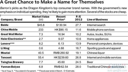 此次《巴倫周刊》根據(jù)公司股價和業(yè)績表現(xiàn),評選出中國十大消費品牌,以帶讀者瀏覽中國本土品牌的新興陣容。按照英文名稱字母順序,分別為:百度;中國移動;長城汽車;海爾電器;聯(lián)想;李寧;茅臺;騰訊;青島啤酒;云南白藥。上榜的汽車品牌只有長城一家。