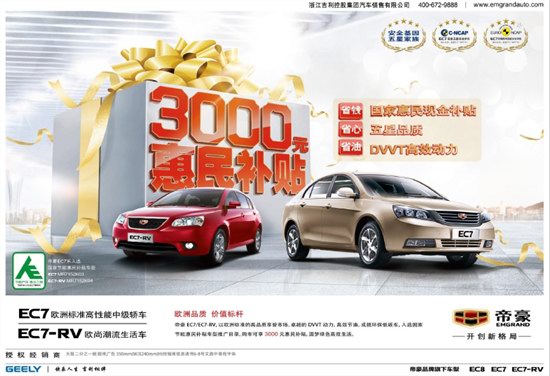 2012年7月11日,國(guó)家發(fā)改委、工信部、財(cái)政部聯(lián)合下發(fā)《第八批“節(jié)能產(chǎn)品惠民工程”節(jié)能汽車推廣目錄》,帝豪品牌EC7系1.5L車型(MR7152K03、MR7152K04)成功入選《節(jié)能產(chǎn)品惠民工程》推廣車型,享受國(guó)家“節(jié)能產(chǎn)品惠民工程”3000元惠民補(bǔ)貼。詳細(xì)信息見(jiàn)下表: