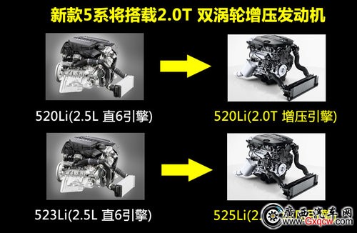 2013款寶馬5系車型較現(xiàn)款在動(dòng)力總成上做出了改變,首先將現(xiàn)款搭載2.5L自然吸氣6缸發(fā)動(dòng)機(jī)的520Li和523Li車型,分別更改為搭載2.0T雙渦輪增壓4缸發(fā)動(dòng)機(jī)的520Li和525Li版本,在發(fā)動(dòng)機(jī)做出改變后,525Li將替代現(xiàn)款523Li進(jìn)入新款5系的產(chǎn)品系列中。此外從名稱上看,我們可以知道520Li的發(fā)動(dòng)機(jī)數(shù)值和新三系320Li是相同的,而525Li的發(fā)動(dòng)機(jī)會(huì)小于328Li的調(diào)教數(shù)值。