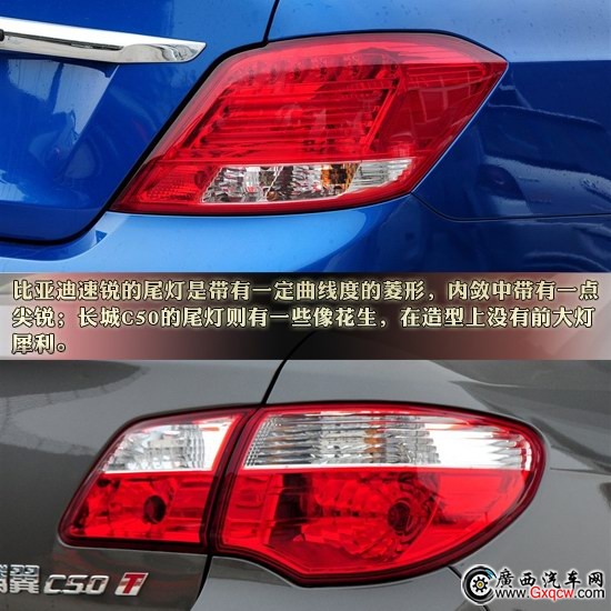 在尾燈方面,比亞迪速銳的尾燈是帶有一定曲線度的菱形,內(nèi)斂中帶有一點(diǎn)尖銳;長城C50的尾燈則有一些像花生,在造型上沒有前大燈犀利。