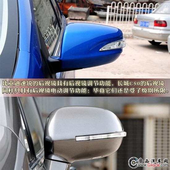 在后視鏡方面,比亞迪速銳的后視鏡具有后視鏡調(diào)節(jié)功能,長城C50的后視鏡同樣只具有后視鏡電動調(diào)節(jié)功能;畢竟它們還是受了級別所限。在造型上,速銳的后視鏡顯得有棱有角,還集成了轉(zhuǎn)向燈,長城C50的后視鏡曲線更柔滑,同樣也集成了轉(zhuǎn)向燈。