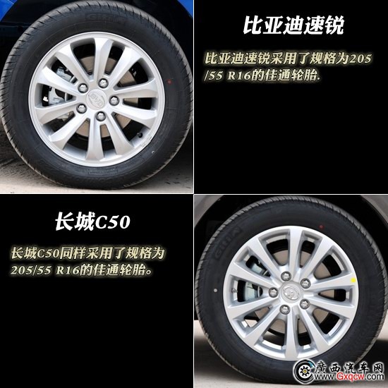 在輪胎方面,比亞迪速銳采用了規(guī)格為205/55 R16的佳通輪胎;長城C50同樣采用了規(guī)格為205/55 R16的佳通輪胎。這個(gè)規(guī)格的輪胎在同級別中還是比較常見,不過它是偏向于舒適型的。