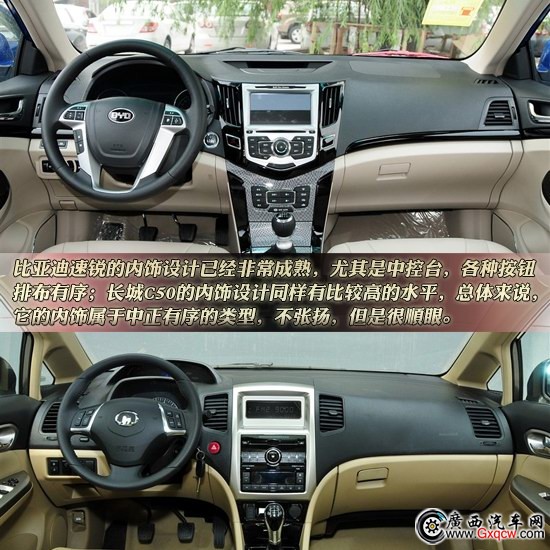 在整體內(nèi)飾方面,比亞迪速銳的內(nèi)飾設(shè)計已經(jīng)非常成熟,尤其是中控臺,各種按鈕排布有序,而米色和黑色的搭配也是比亞迪的傳統(tǒng)內(nèi)飾配色。長城C50的內(nèi)飾設(shè)計同樣有比較高的水平,總體來說,它的內(nèi)飾屬于中正有序的類型,不張揚(yáng),但是很順眼。