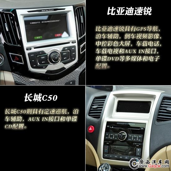 在娛樂和多媒體電子配置方面,比亞迪速銳具有GPS導(dǎo)航,泊車輔助,倒車視頻影像,中控彩色大屏,車載電話,車載電視和AUX IN接口,單碟DVD等;長城C50則具有定速巡航,泊車輔助,AUX IN接口和單碟CD等。與比亞迪速銳相比,長城C50的娛樂和多媒體配置顯得過于貧乏,由此也可看出比亞迪速銳的配置優(yōu)勢在同級車中高到何種程度。