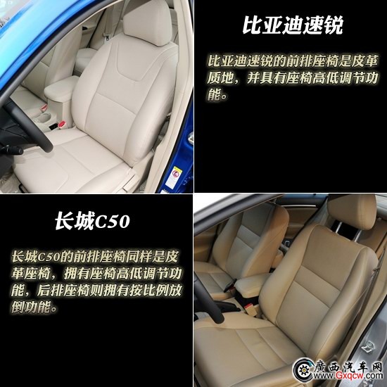 在座椅方面,比亞迪速銳的前排座椅是皮革質(zhì)地,并具有座椅高低調(diào)節(jié)功能,長城C50的前排座椅同樣是皮革座椅,擁有座椅高低調(diào)節(jié)功能,后排座椅則擁有按比例放倒功能。在這個方面,兩款車型都只做到了中規(guī)中矩。