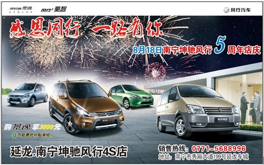 8月南寧坤馳5周年店慶月,全系車型景逸1.5XL、景逸LV、景逸SUV、菱智M5、菱智1.6……最高優(yōu)惠萬(wàn)元。限量廠家特供車型、店慶特價(jià)車驚爆價(jià)格!老客戶帶新客戶到店購(gòu)車贈(zèng)送常規(guī)保養(yǎng),F(xiàn)在活動(dòng)倒計(jì)時(shí),關(guān)注景逸的車友們不要錯(cuò)過(guò)了。。。。。。詳詢:5688996