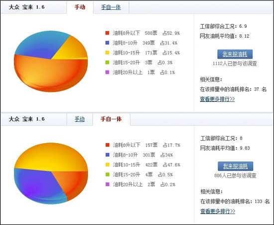 【寶來1.6L手動與手自一體車型,搜狐網(wǎng)友提供的平均油耗值】