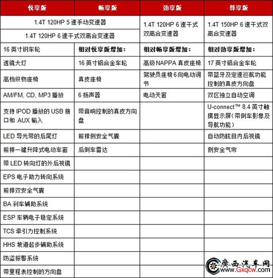 最高配的尊享版(搭載6速干式雙離合變速器)則在勁享版基礎(chǔ)上增加了17英寸鋁合金車輪、側(cè)安全氣簾、帶倒車影像及導(dǎo)航功能的UconnectTM 8.4英寸觸屏導(dǎo)航系統(tǒng)、帶藍(lán)牙及定速巡航功能控制的真皮多功能方向盤、雙區(qū)獨立自動空調(diào)和自動防炫目內(nèi)后視鏡。