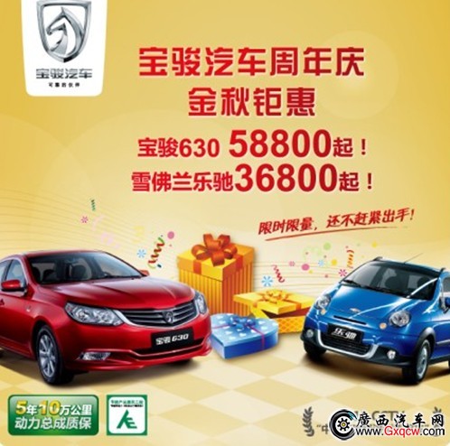 近日,編輯從南寧地區(qū)寶駿汽車4S店了解到,為慶祝寶駿630上市1周年,自8月17日起至10月31日,寶駿汽車將在全國范圍內(nèi)開展周年慶金秋鉅惠活動(dòng),旗下兩款主力車型——寶駿630 1.5L手動(dòng)檔車型及樂馳將分別以5.88萬元及3.68萬元的底價(jià)限時(shí)、限量銷售。這是自寶駿630上市以來,寶駿汽車首次舉辦的官方促銷活動(dòng),消費(fèi)者將有機(jī)會(huì)以超低價(jià)格享受到寶駿汽車的國際品質(zhì)產(chǎn)品及服務(wù)。