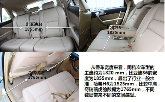 從整車寬度來看,1820 mm左右的成績算是同檔次車型的主流,正常狀態(tài)下坐滿三個成年人均不成問題。其中,比亞迪S6的寬度為1855mm,超出了行業(yè)一般水準(zhǔn),自然能夠?yàn)檐噧?nèi)乘客帶來更加寬適的乘車感覺。哈弗H6處在比較中庸的數(shù)據(jù),為1825mm,奇瑞瑞虎的數(shù)據(jù)則大大低于平均水準(zhǔn),只有1765mm,車內(nèi)空間相較前兩者顯得局促許多。