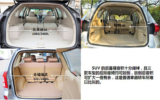 最后再來比較一下三款車型在“載物”方面的表現(xiàn),這項指標(biāo)主要體現(xiàn)在后備箱容積和車內(nèi)儲物空間兩方面。令人驚喜的是,三款車均采用了可拆分式折疊的后排座椅,以應(yīng)付載物時的不同需求。其中,比亞迪S6憑借1084/2400L的漂亮數(shù)據(jù)再次拔得頭籌,哈弗H6和瑞虎的后備箱容積分別為808/2010L和520/1800L。相比于后二者,比亞迪S6 的后備箱容積優(yōu)勢十分明顯,足以應(yīng)付家庭外出旅游、小型搬家等日常需要。