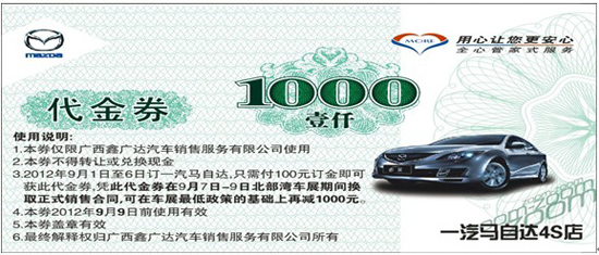 2、 在活動(dòng)期間訂購(gòu)一汽馬自達(dá)全系車(chē)型可享受7日-9日北部灣車(chē)展最低價(jià)的基礎(chǔ)上再減1000元現(xiàn)金。無(wú)須擔(dān)心車(chē)展價(jià)格低,現(xiàn)在政策超越車(chē)展政策,訂的越早優(yōu)惠越大,不要猶豫,馬上下訂。0771-3220111