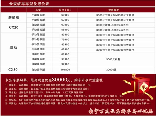 編輯了解到,9月7日-9月9日,南寧萬友長安轎車空前鉅惠,長安全系最高鉅惠30000元現(xiàn)金,期間購車樂享六重豪禮。