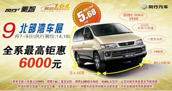 北部灣車展于9月7日至9日在南寧市會展中心隆重上演,風(fēng)行14,18展位;本次車展大幅讓利,全系冰點(diǎn)優(yōu)惠價,絕對超值,購車最高讓利6000元;菱智1.6為國內(nèi)首款小排量,大空間,全能商務(wù)車,售價5.68-7.88萬之間。歡迎蒞臨4S店或車展現(xiàn)場,詳詢0771-4866322,公司地址:南站大道29號。