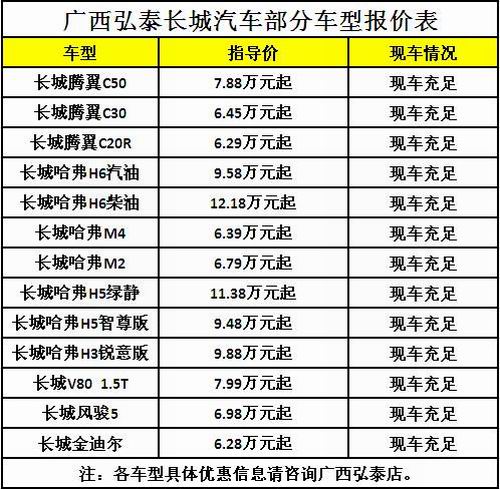 為了回饋廣大消費(fèi)者對弘泰長城汽車的支持與青睞,廣西弘泰特地向長城汽車廠家申請了大量不同車型的廠家直銷車,且在九月推出了“惠千•萬”特惠系列活動,根據(jù)長城廠家政策,廣西弘泰長城特惠車的具體車型數(shù)量有限并不定時不間斷的推出,打算搶購弘泰長城特惠車的消費(fèi)者一定要及時關(guān)注廣西弘泰不斷更新的特惠信息,您最先下手,特惠車就屬于您!