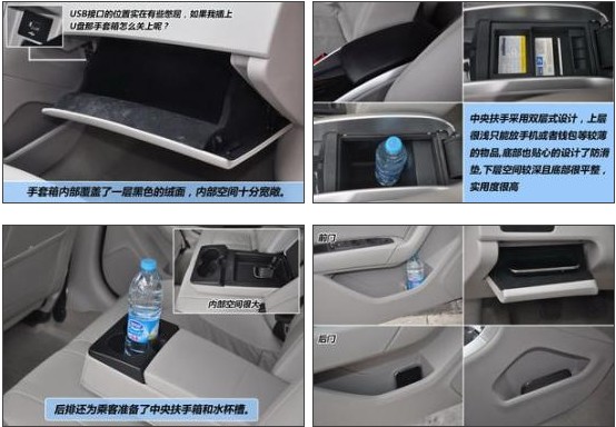 儲物空間布置上,檔把前有一塊非常可觀的空間,方便放置零碎物品;中央扶手箱只有單層設(shè)計,但里面進深很大,扶手箱之前有兩個帶有蓋子的杯托。前門板空間很大,后門板空間較小,但都能夠放置水杯。