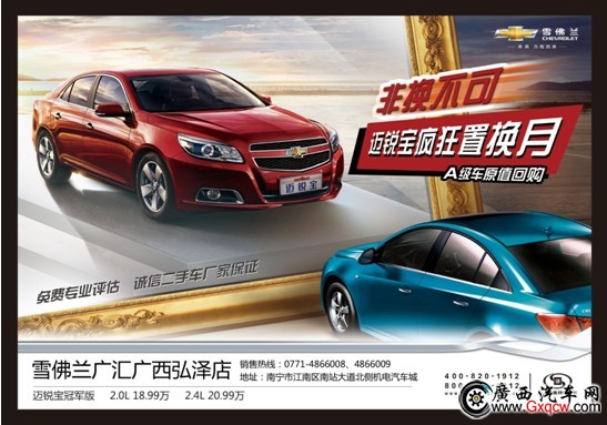 雪佛蘭廣西唯一雙三星級經(jīng)銷商,廣西弘澤本周末閉館特賣,最高鉅惠3.5萬!原價回購置換邁銳寶活動火熱啟動,銷售電話:0771-4866008