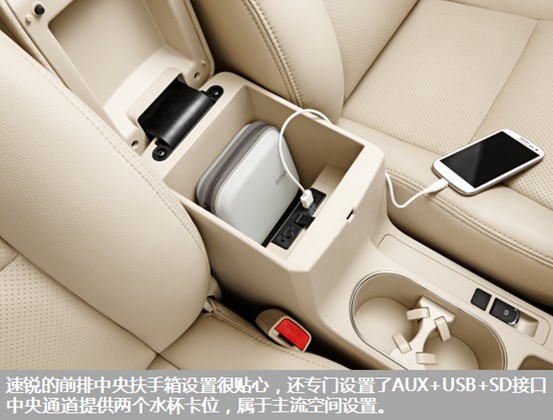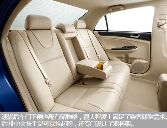 了解完前排存儲空間之后,再來看看速銳的后排儲物空間。首先,后車門下側(cè)也配有儲物格,后門儲物格的容積較前門相比略小,但儲物格的開口較大,可以容納標(biāo)準(zhǔn)的飲料瓶。后排座椅的中央扶手還專門設(shè)計了雙杯架,很貼心。整體來看,速銳在車內(nèi)儲物空間方面設(shè)計很人性化,隨身攜帶的物品很容易找到適當(dāng)?shù)姆胖梦恢,并且取放都非常方便?/P>