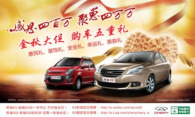 為了慶賀400萬(wàn)輛下線,奇瑞汽車傾情啟動(dòng)“感恩四百萬(wàn) 聚惠四萬(wàn)萬(wàn)”主題活動(dòng),以“金秋大促 購(gòu)車五重禮”的鉅惠感恩廣大消費(fèi)者。9月1日-11月30日期間,消費(fèi)者購(gòu)買奇瑞E5、奇瑞QQ、旗云系列等車型,均可享受不同程度的鉅惠,感受奇瑞汽車實(shí)實(shí)在在的關(guān)愛。