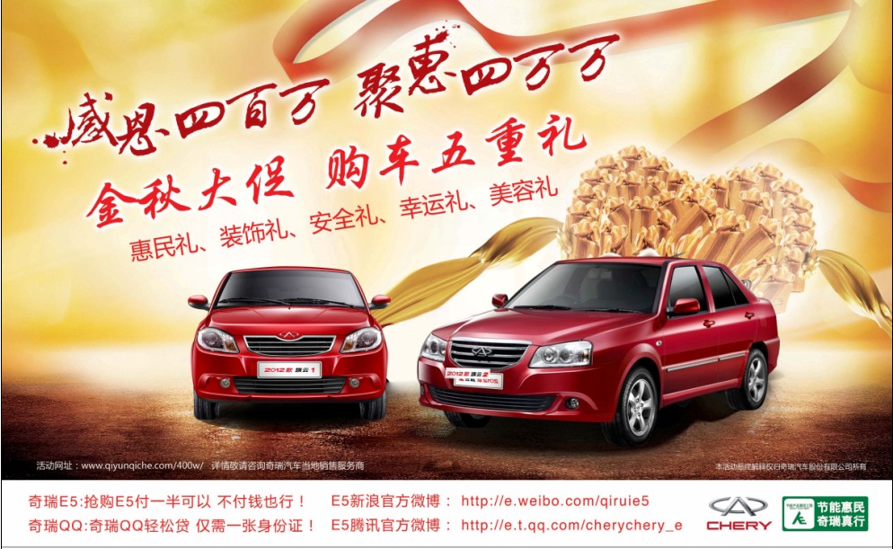 活動(dòng)期間,購買旗云1、旗云2、旗云3的用戶,即可暢享奇瑞汽車五重金秋豪禮:惠民禮、裝飾禮、安全禮、幸運(yùn)禮、美容禮五重大禮。