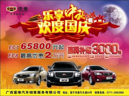(廣西汽車網(wǎng) 訊)近日,編輯從廣西富緣帝豪4S店了解到,目前該店為迎接中秋、國慶雙節(jié),并在9月29日---10月2日安吉車展期間,帝豪推出每天僅限3輛的廠家直銷特惠車。此外,帝豪EC7惠民超悅版享受國家節(jié)能補貼3000元,最高優(yōu)惠13000元,EC8尊享9折,另送6000大禮包,驚喜好禮等你拿。廣西富緣帝豪B18號展位恭候您的光臨。