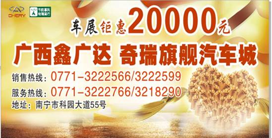 9月29日為期四天的廣西第二十屆汽車交易會(huì)正式拉開帷幕,此次車展鑫廣達(dá)奇瑞最高鉅惠20000元。車展期間車友、市民可持奇瑞的宣傳單頁到展位領(lǐng)取精美禮品一份。