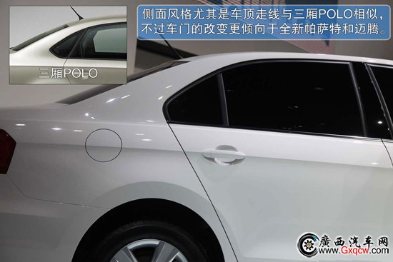 在側(cè)面,可以清晰地看到全新捷達使用了貫穿車身前后的腰線設(shè)計,不僅如此,在側(cè)裙邊緣也同樣有明顯的平行線來刻畫側(cè)面細節(jié),這使得全新捷達側(cè)面更具備了動態(tài)感。實際上因為與全新POLO三廂是出于同一平臺,側(cè)面風(fēng)格仍有不少POLO三廂的影子,尤其是車頂輪廓和腰線最為明顯,不過對于后車門的重新設(shè)計,全新捷達更傾向于全新帕薩特和全新邁騰的風(fēng)格。