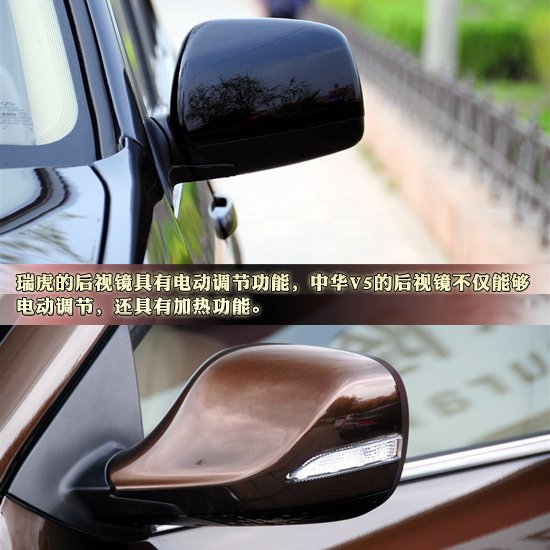 在后視鏡方面,瑞虎的后視鏡具有電動調(diào)節(jié)功能,中華V5的后視鏡不僅能夠電動調(diào)節(jié),還具有加熱功能。后視鏡加熱功能在即將到來的冬季一定會有用,所以中華V5在功能性上勝出一籌。
