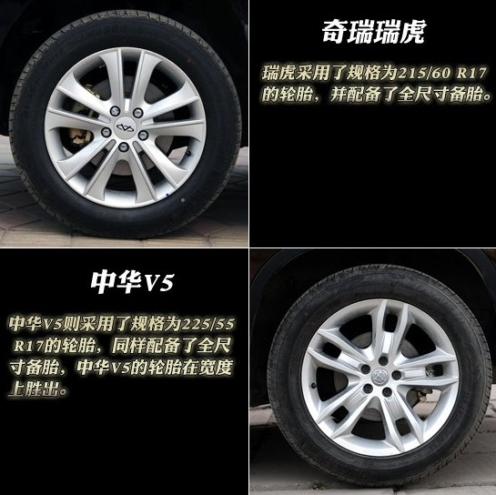 在輪胎方面,瑞虎采用了規(guī)格為215/60 R17的輪胎,并配備了全尺寸備胎。中華V5則采用了規(guī)格為225/55 R17的輪胎,同樣配備了全尺寸備胎。中華V5的輪胎在寬度上勝出,而兩款車都配備全尺寸備胎是很值得稱贊的一點。
