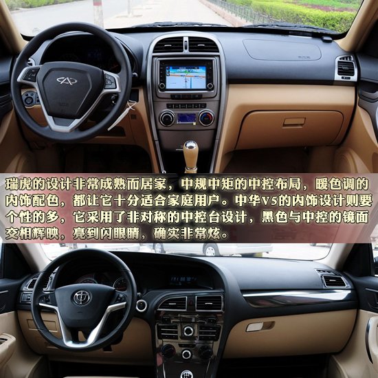 在內(nèi)飾設(shè)計上,瑞虎的設(shè)計非常成熟而居家,中規(guī)中矩的中控布局,暖色調(diào)的內(nèi)飾配色,都讓它十分適合家庭用戶。中華V5的內(nèi)飾設(shè)計則要個性的多,它采用了非對稱的中控臺設(shè)計,黑色與中控的鏡面交相輝映,亮到閃眼睛,確實非常炫。這兩種內(nèi)飾設(shè)計各有各的好處,也許有一些年輕人會喜歡中華V5的設(shè)計,但是大多數(shù)人會對瑞虎的內(nèi)飾有更高的接受度。