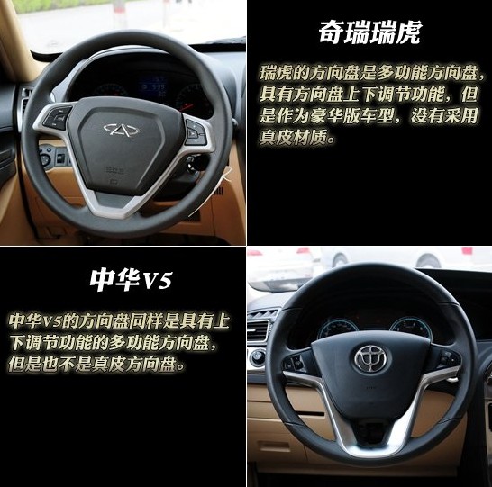 在方向盤方面,瑞虎的方向盤是多功能方向盤,具有方向盤上下調(diào)節(jié)功能,但是作為豪華版車型,沒有采用真皮材質(zhì)。中華V5的方向盤同樣是具有上下調(diào)節(jié)功能的多功能方向盤,但是也不是真皮方向盤。兩車的方向盤還是提供了基本的功能,只是限于定位關(guān)系,在材質(zhì)上有些節(jié)省了。