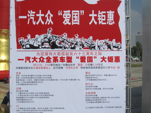 “一汽-大眾‘愛(ài)國(guó)’大鉅惠”的優(yōu)惠信息展架