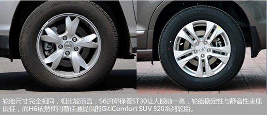 輪轂輪胎尺寸方面兩款車都比較厚道,17寸的鋁合金輪轂基本撐起了車輛的門面,而輪轂的造型也都有著自己的風(fēng)格。輪胎尺寸也是完全相同,225mm的胎寬配合65的扁平比有那么點(diǎn)野味,符合SUV的定位。相比較而言, S6的鄧祿普ST30讓人眼前一亮,輪胎穩(wěn)定性與靜音性表現(xiàn)俱佳,而長城H6依然使用著佳通提供的GitiComfort SUV 520系列輪胎。