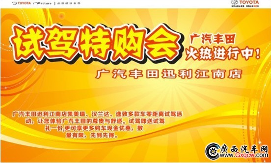 很多事,嘗試過才知道,很多人,體驗后才更深刻。車也一樣!即日起,廣汽豐田迅利江南店凱美瑞、漢蘭達、逸致、雅力士多款車提供零距離試駕活動,讓您體驗廣汽豐田的尊貴與舒適。試駕即送廣汽豐田專屬試駕禮一份,更可享更多購車現(xiàn)金優(yōu)惠,優(yōu)惠價格直探全市最低價。