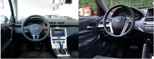 內(nèi)飾上,邁騰用料更顯檔次。中控臺(tái)上端采用軟質(zhì)材料覆蓋,中控臺(tái)覆蓋鍍鉻和鋁制裝飾,配有復(fù)古式石英表,彰顯奢華低調(diào)的風(fēng)格。方向盤采用了三幅式的多功能方向盤,手感出色。雅閣內(nèi)飾做工也不錯(cuò),塑料材質(zhì)看起來跟金屬一樣有質(zhì)感,手感就稍微差了些。