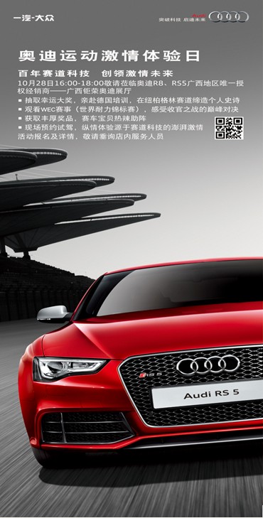 結(jié)合奧迪銷售事業(yè)部舉行的奧迪R8、RS5高性能運(yùn)動(dòng)車戰(zhàn)略發(fā)布以及WEC賽事轉(zhuǎn)播活動(dòng),10月28日將在經(jīng)銷商終端開(kāi)展奧迪運(yùn)動(dòng)激情體驗(yàn)日主題活動(dòng)。鉅榮奧迪很榮幸成為廣西地區(qū)舉辦此次活動(dòng)的唯一授權(quán)經(jīng)銷商。