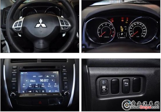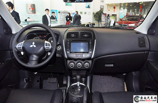ASX勁炫的內(nèi)飾采用了全黑的設(shè)計,銀色的裝飾增加了運動感,黑底白字雙炮筒儀表簡單明了,卻不失為個性。儀表中間的彩色液晶顯示屏分辨率不錯,畫質(zhì)很細(xì)膩,很多常用的功能如水溫、油量等也都被放在這里顯示,看上去要比那種單色液晶舒服很多。